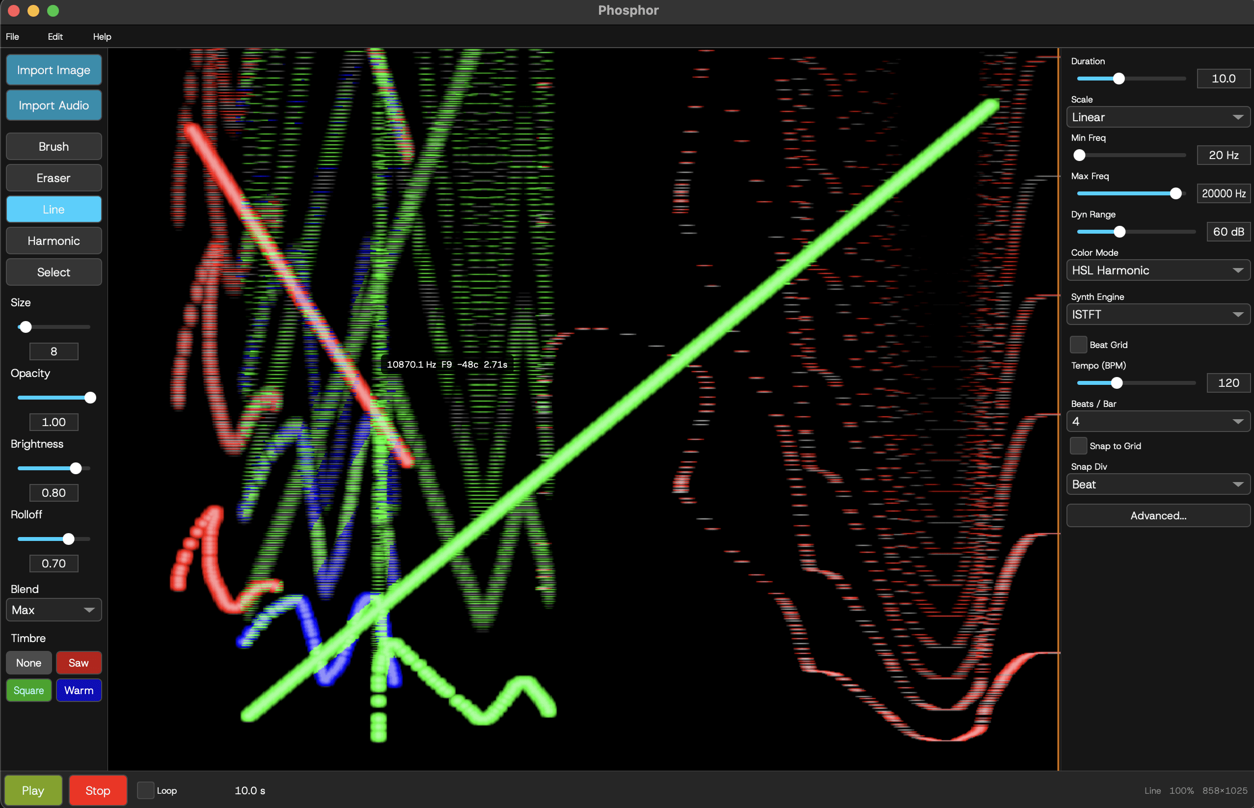 Draw directly onto a spectrogram canvas. Horizontal lines become tones, diagonals become sweeps, clouds of brightness become textures. The frequency axis maps to musical octaves, so what you see is what you hear.